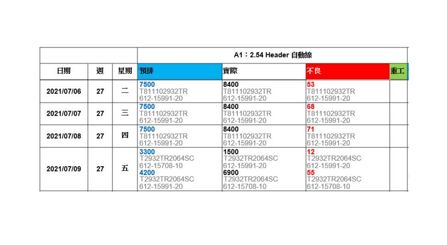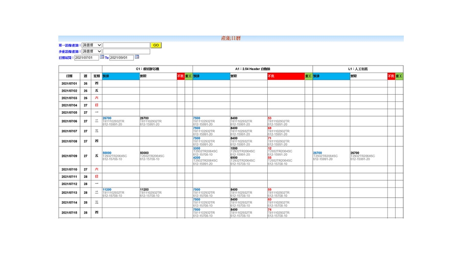 由產能日曆可以看出讓各工序之當日預排數量, 實際完成數量, 不良及重工數量. 如下: